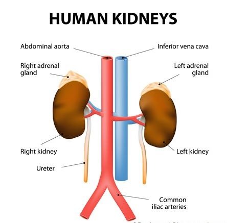 The kidneys are situated below the diaphragm, one on either side of the spine. They are just below the rib cage. Each bears a small but crucial cap of endocrine tissue called the adrenal gland, which produce the important steroid hormones of the body.